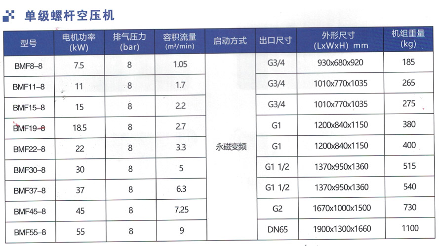 产品名称:单级永磁变频空压机产品型号:BMF22-8功率:22KW排气量:3.3m³/min